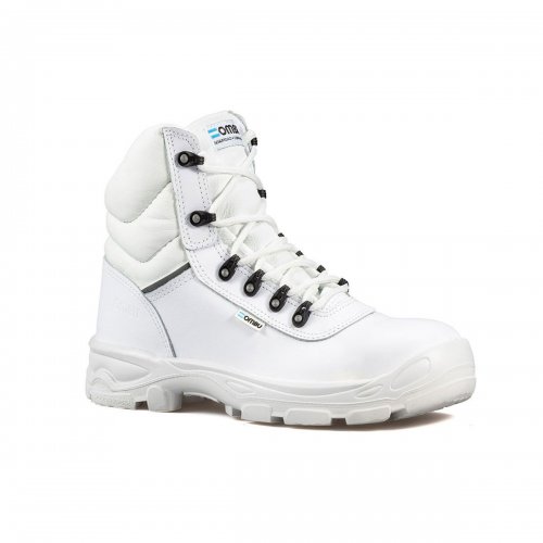 Botín de seguridad blanco Ombu con puntera de acero, capellada de cuero flor napa y suela PU bidensidad antideslizante. Ideal para industrias que requieren higiene, protección y confort.