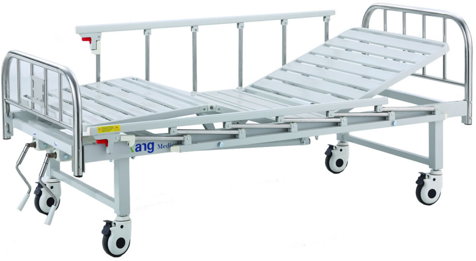 Cama ortopédica con doble movimiento mecánico, estructura en acero SAE 1010, barandas plegables y ruedas con freno. Ideal para internación clínica. No incluye colchón.