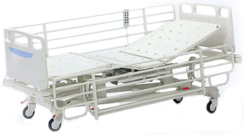 Cama ortopédica eléctrica con 5 funciones motorizadas, barandas con amortiguación, sistema de freno central y respaldo de emergencia. Ideal para internación y terapia intensiva.