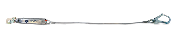 Cola de amarre anticaída de 1,5m fabricada en cable de acero, ideal para trabajos de soldadura en altura. Incluye amortiguador y mosquetones de 18mm y 55mm.