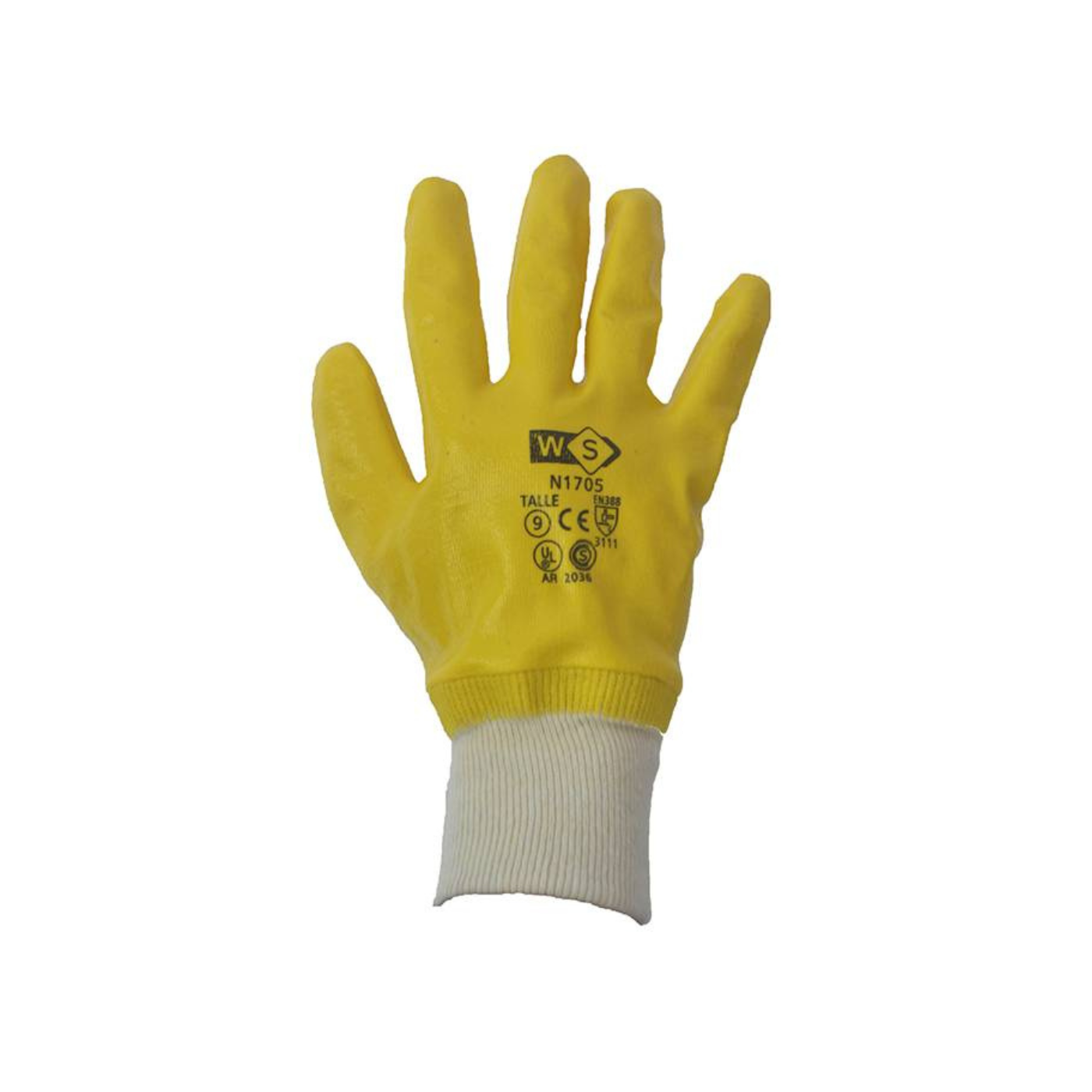 - Material: Interlock de algodón con recubrimiento completo en nitrilo amarillo
