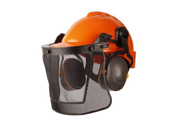 Kit forestal integrado con protector facial de malla, protección auditiva y craneana. Visor rebatible 90° para trabajos forestales de alta exigencia y máxima seguridad.