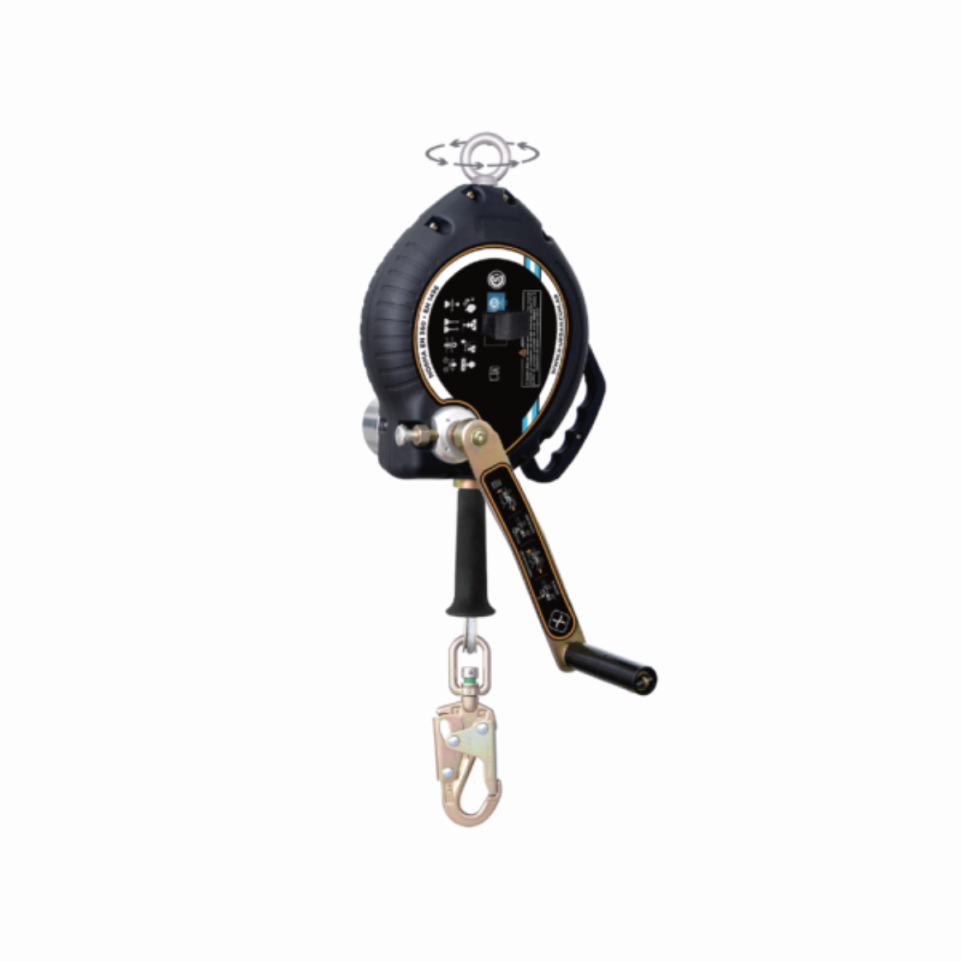 Incluye un mosquetón forjado giratorio con testigo de caída que permite verificar el estado del equipo de manera sencilla, así como un punto de enganche giratorio que mejora la movilidad del usuario y evita torsiones del sistema. Cada componente está orientado a reducir riesgos y facilitar un uso seguro y estable.